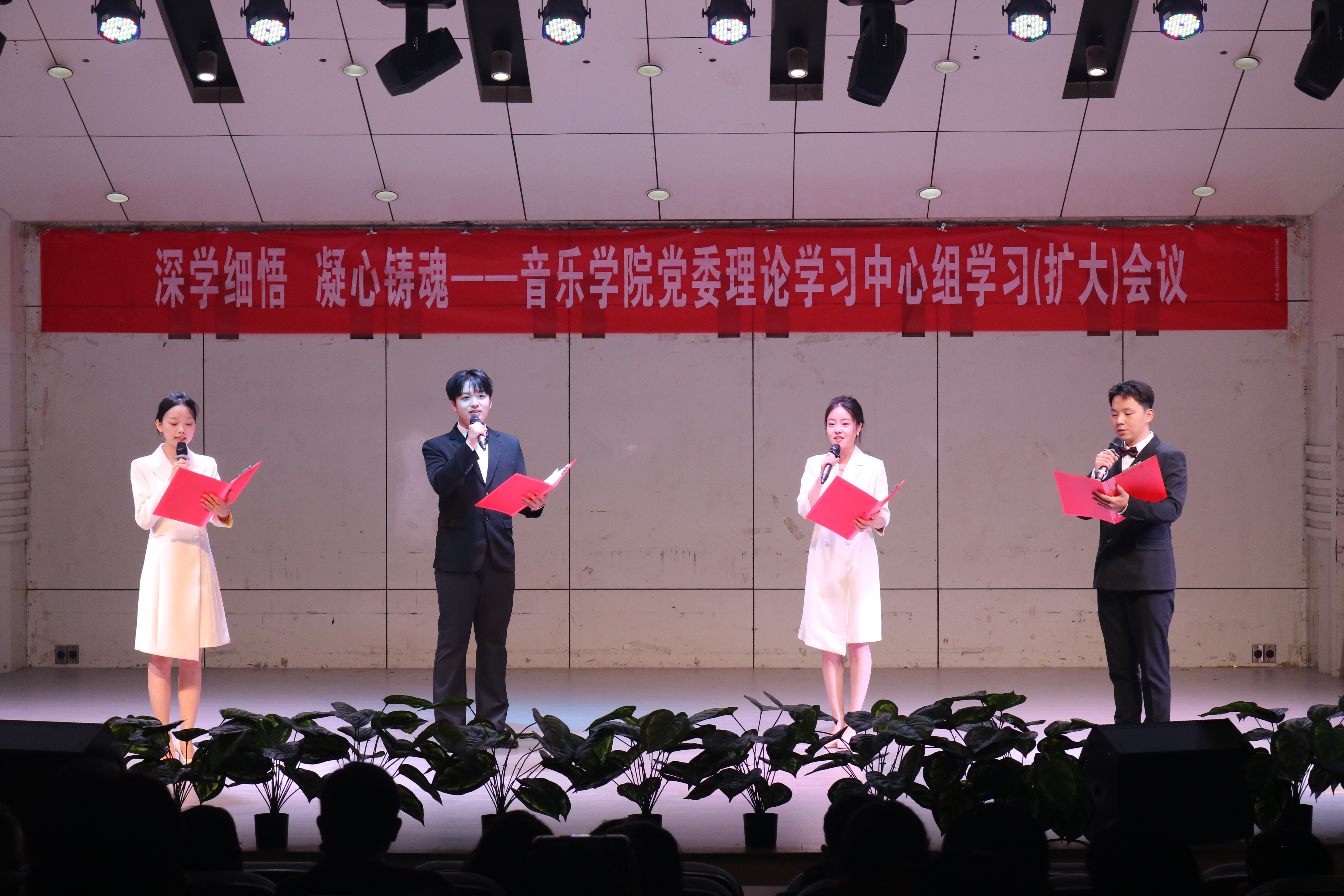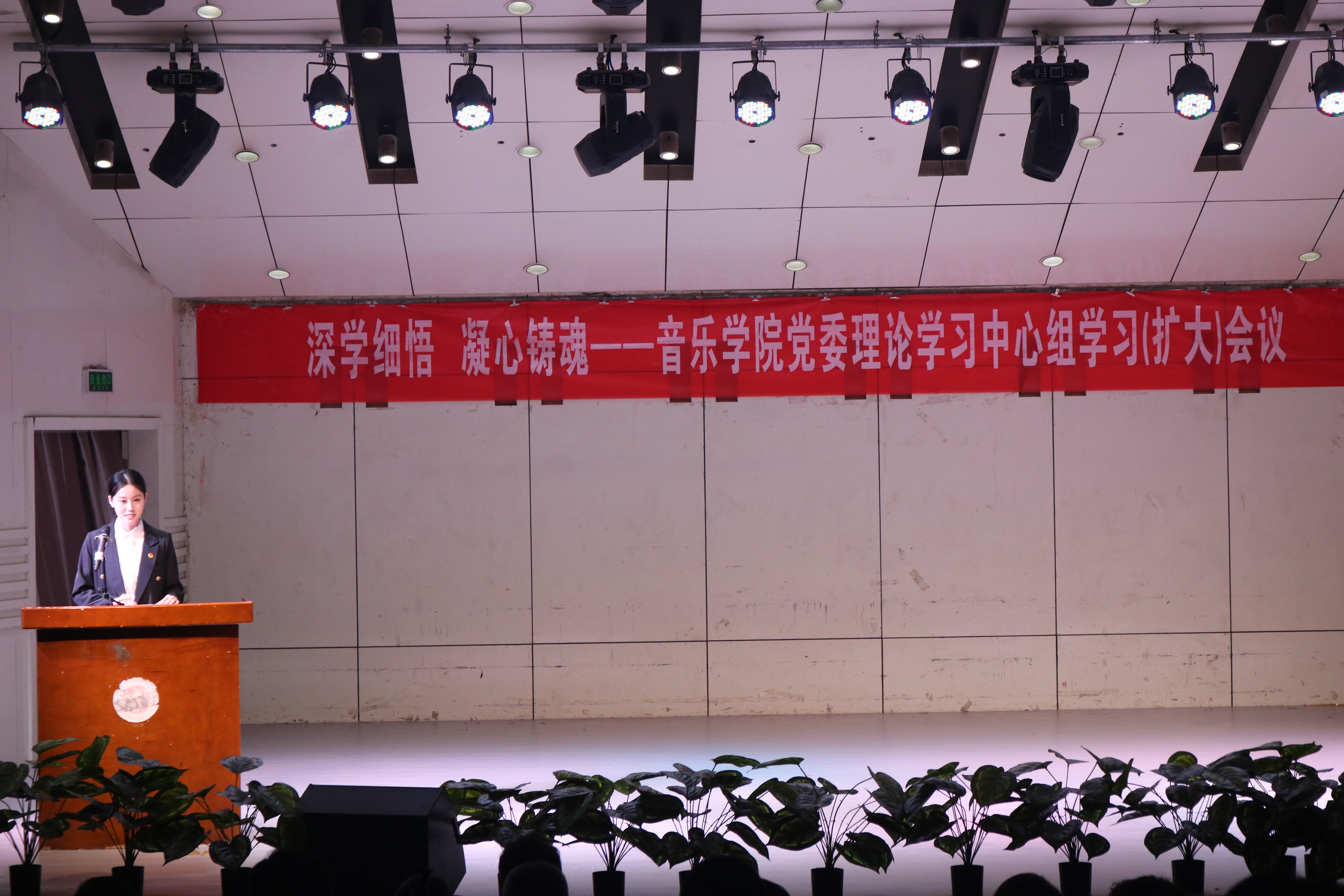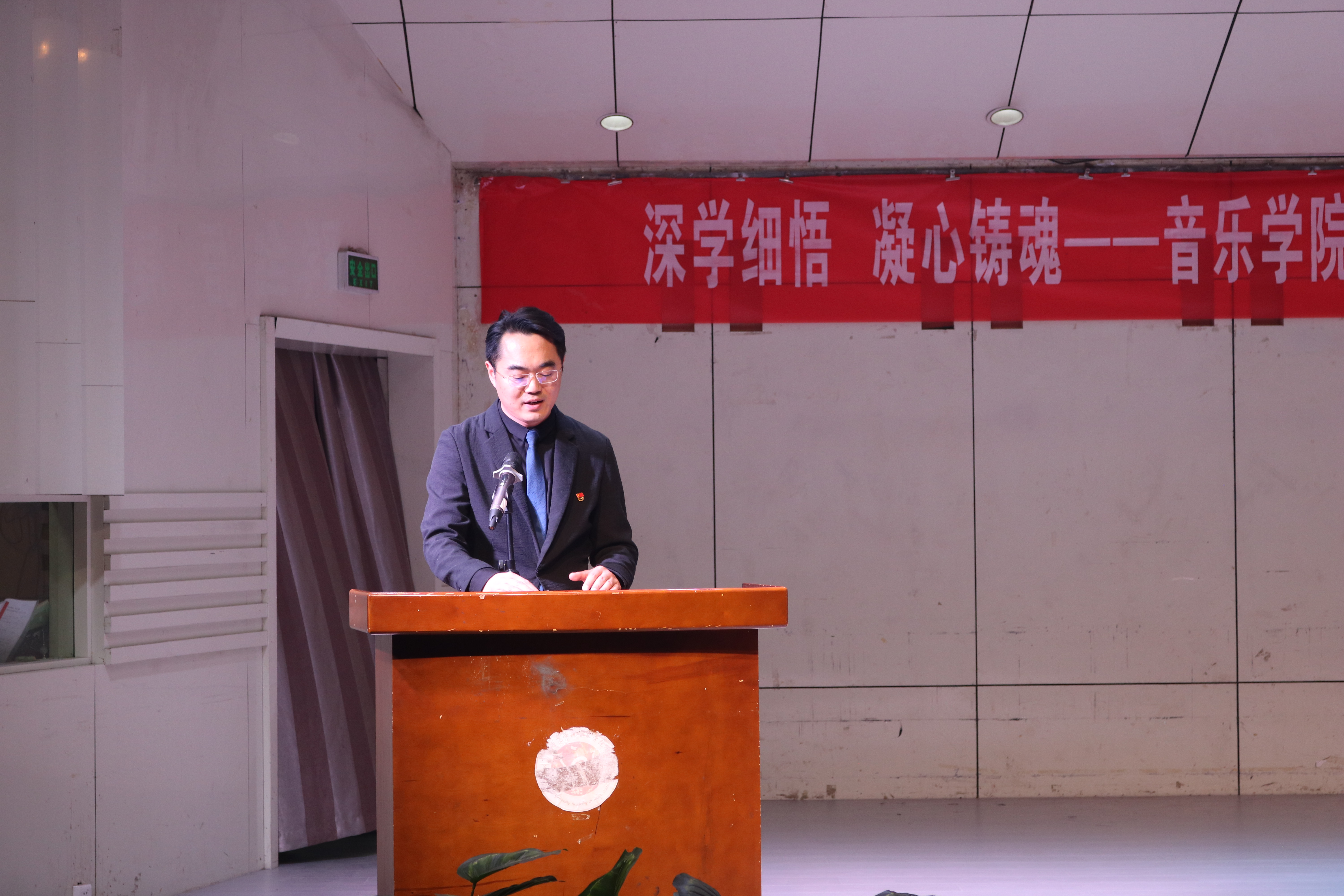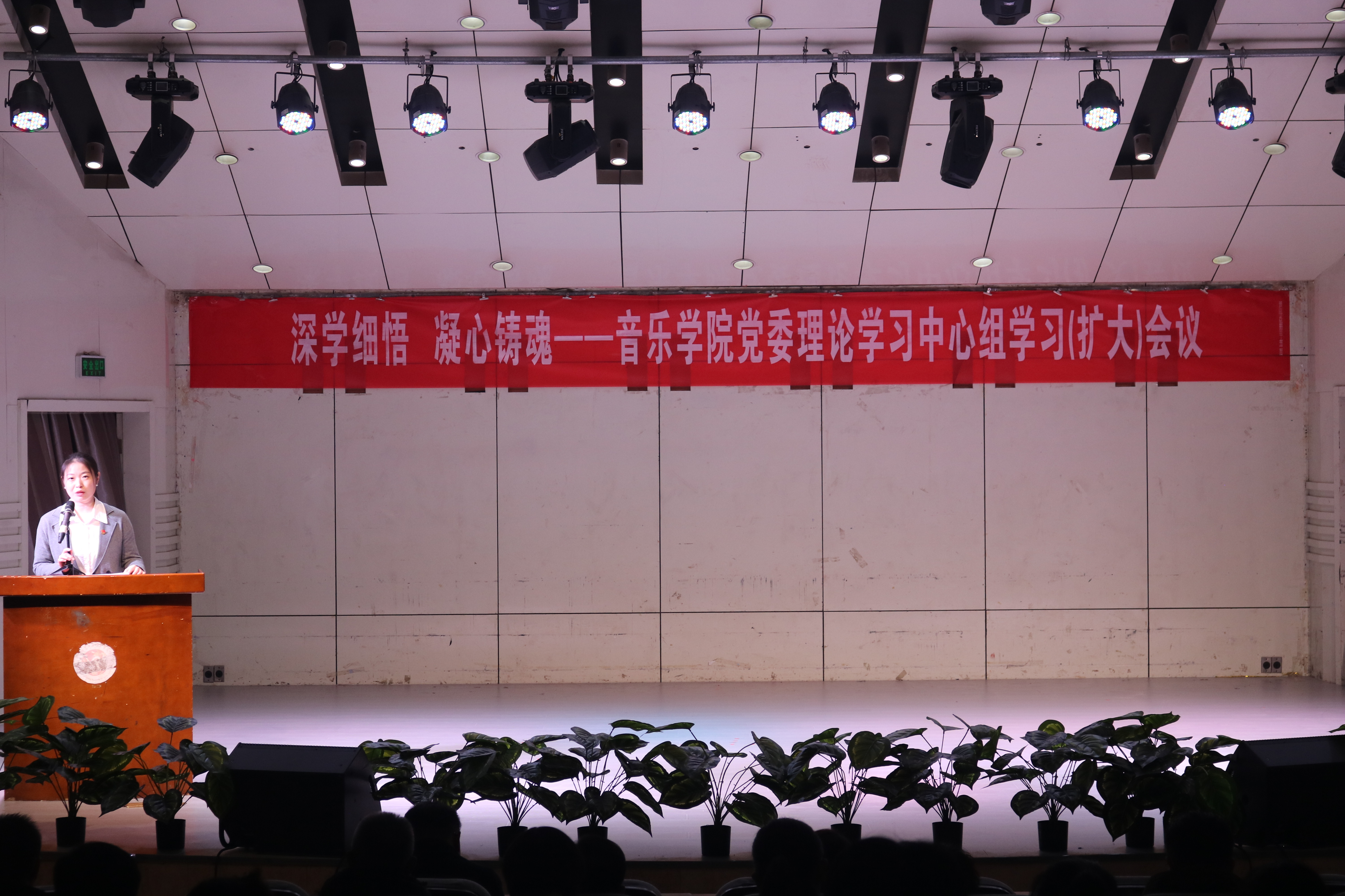 本次学习突破传统模式,创新采用“理论宣讲+舞台实践+感悟分享”三位一体的沉浸式学习方式。学院党委书记彭分田带头领学,围绕新时代音乐舞蹈学科发展,强调要坚持立德树人根本任务,扎根时代生活,强化学科内涵,服务社会大众,推动学科高质量发展。
